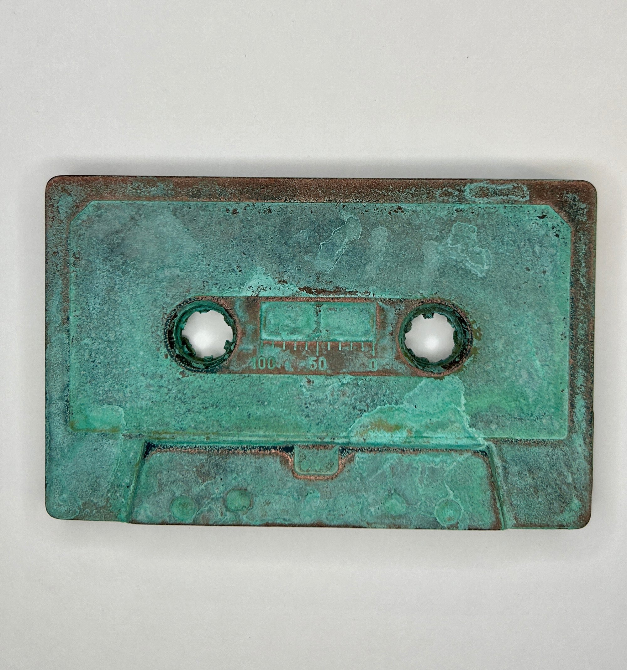 Growing up in the 1980s, we made mixtapes for our most cherished friends to share new music. This mixtape includes a cast resin cassette tape with a unique weathered copper patina on its face. Also included is a QR code that will direct you to a special playlist with an eclectic mix of some of my favorite music from the 1980s.