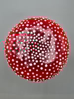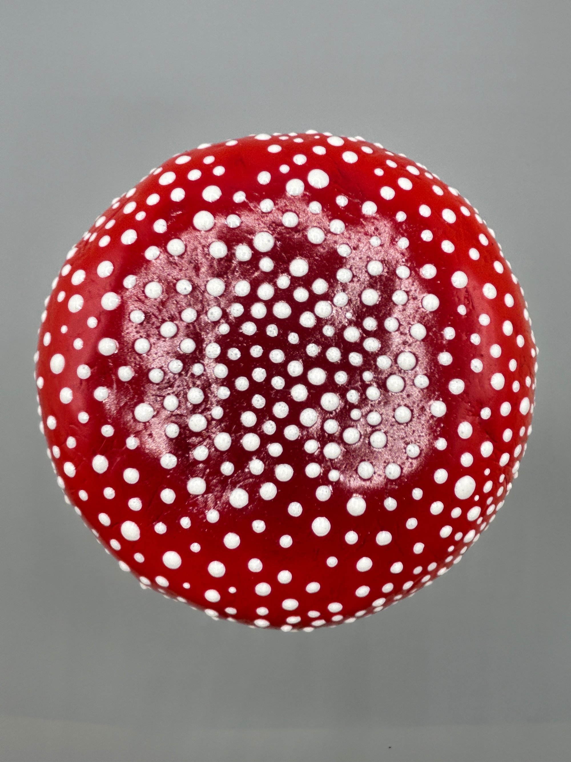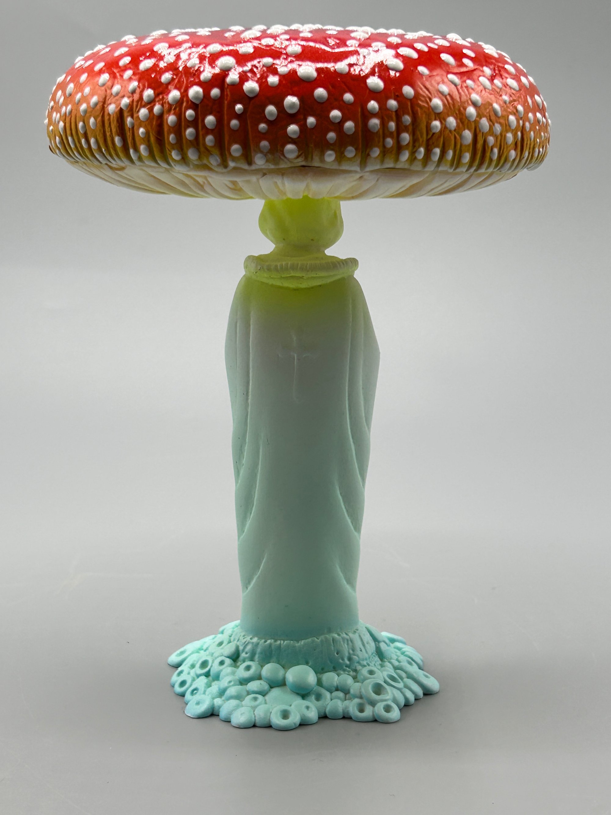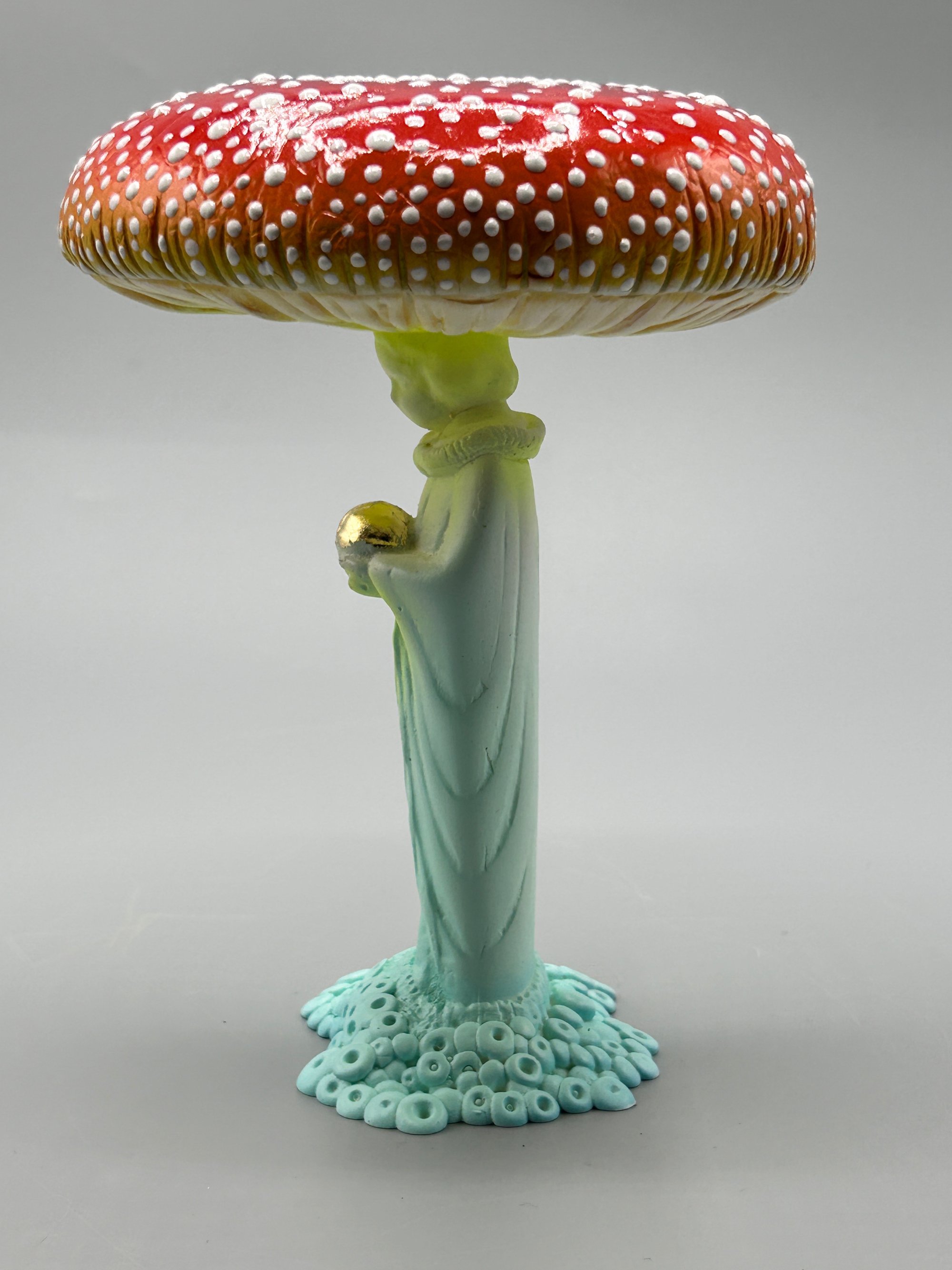 These mushroom saints are made from cast resin and epoxy clay and measure 7 inches tall by 5.5 inch diameter. The sphere the figure is holding is gilded with faux gold leaf.